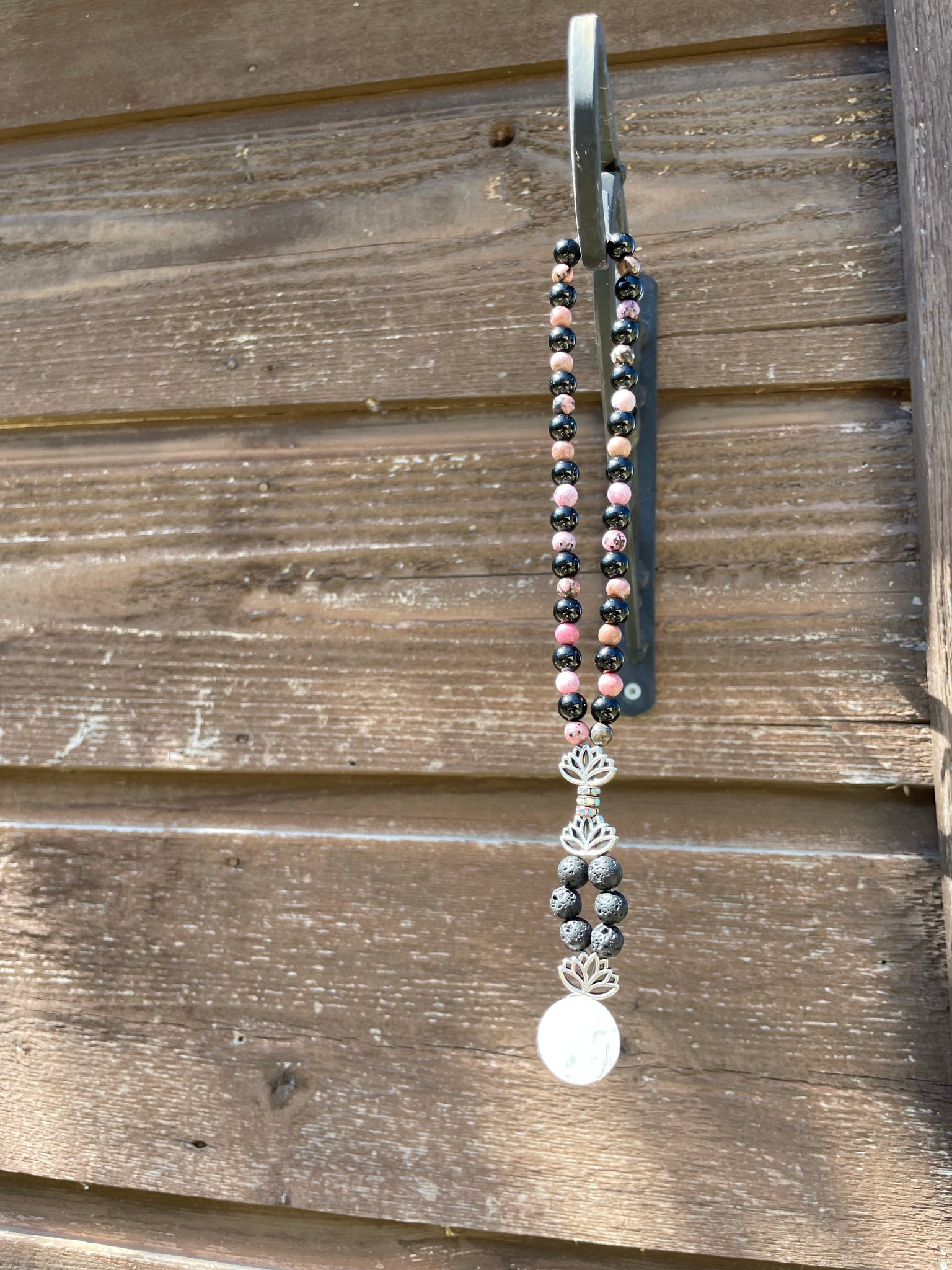 Beautiful sun catcher created with Rhodonite and black Jasper stones. For power and protection. A crackle Quartz bead represents the full moon.